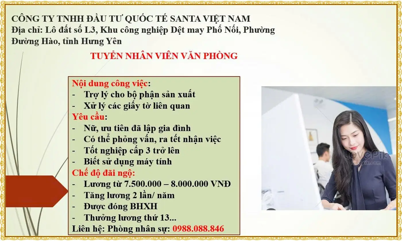 📍 Làm việc tại: thôn Liêu Thượng, Xã Nguyễn Văn Linh, Hưng Yên( đối diện kcn Thăng Long 2)
