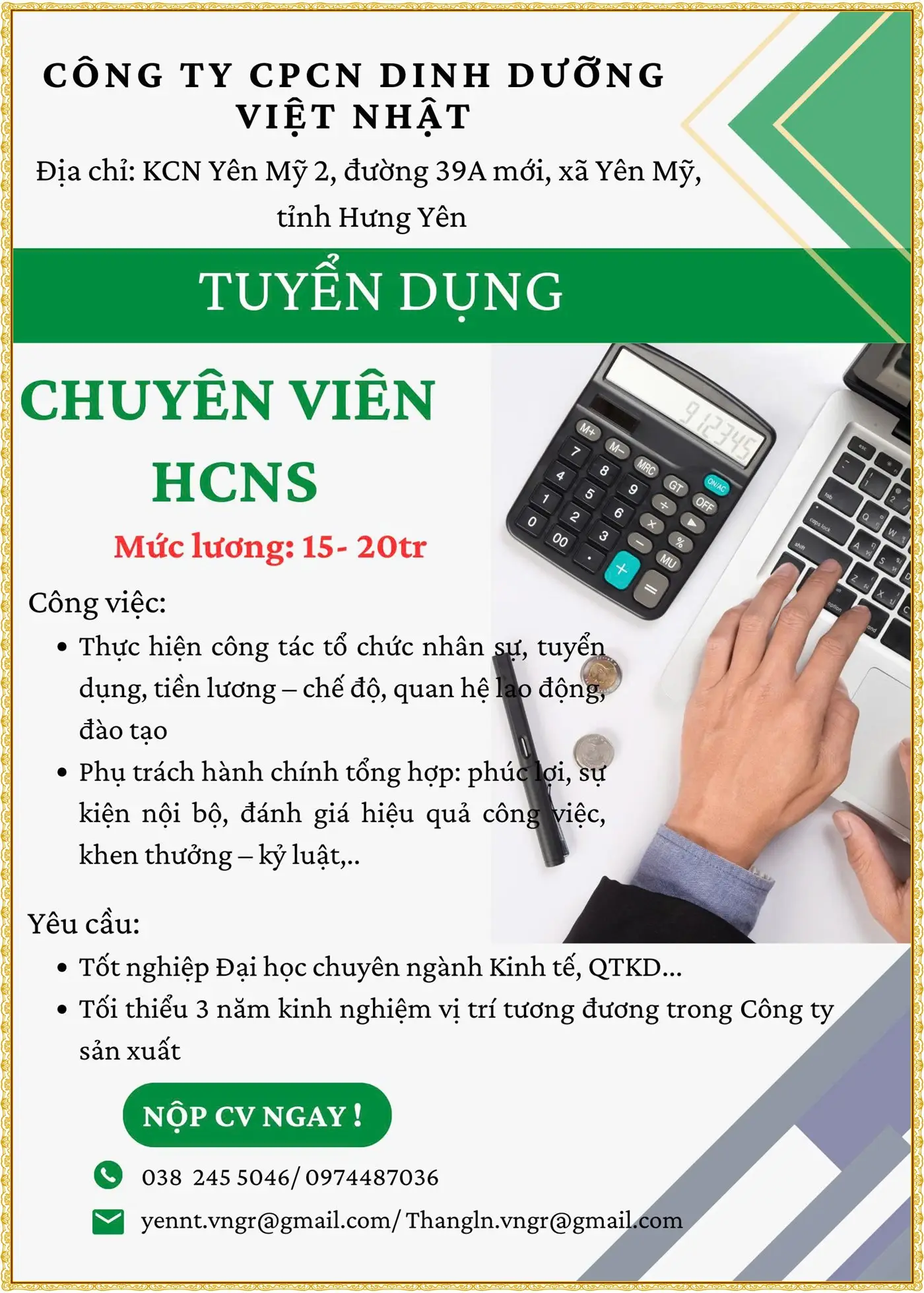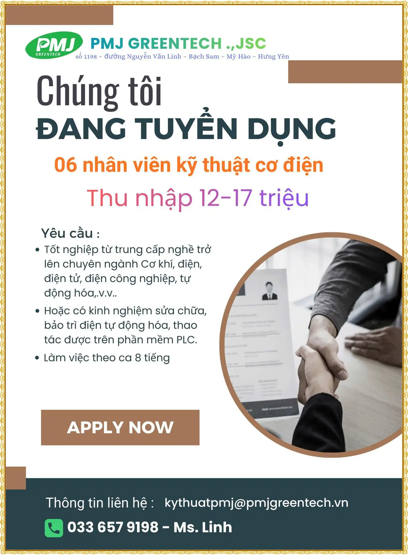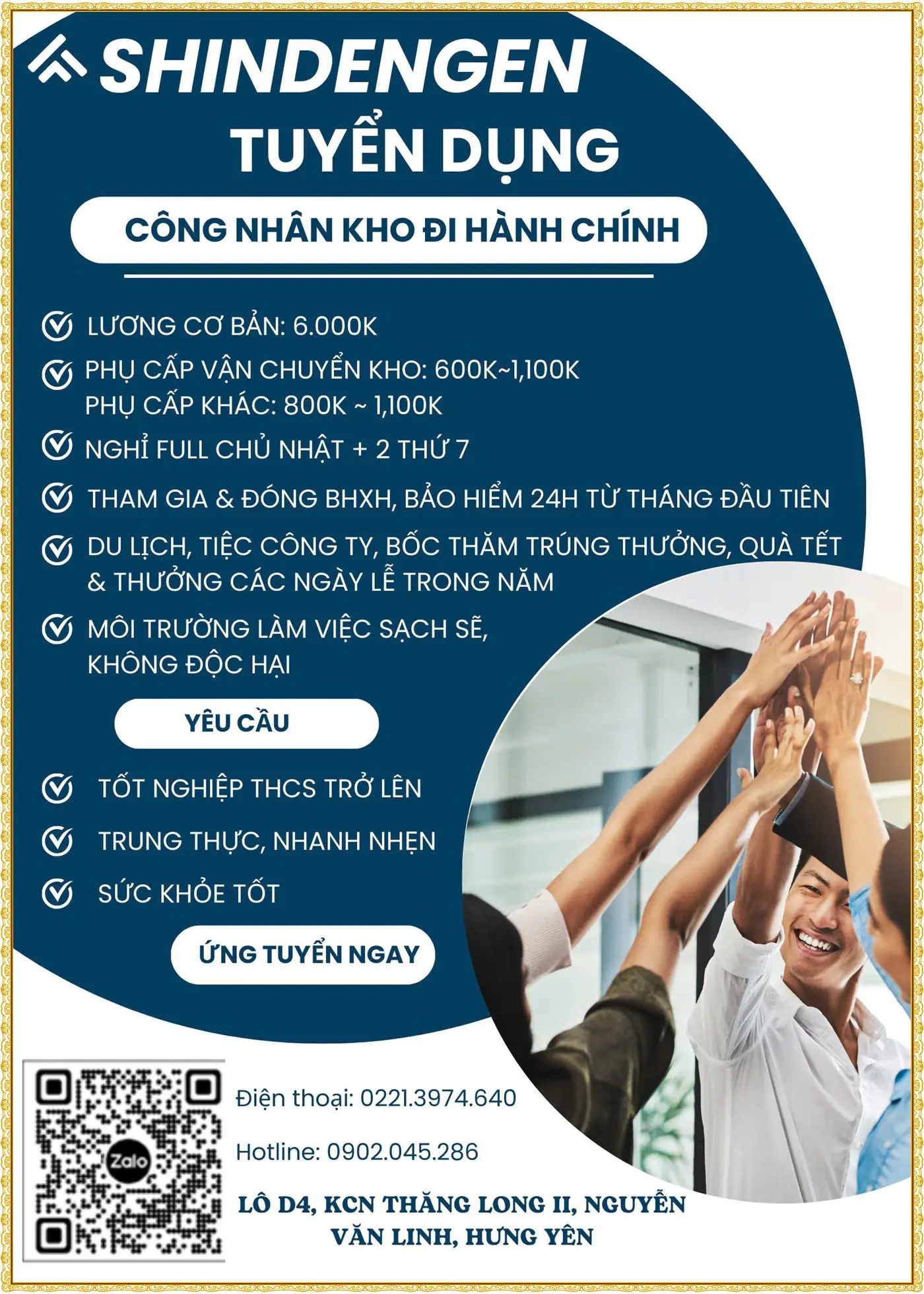 📍 ĐỊA ĐIỂM LÀM VIỆC: KCN Sạch Ân Thi – Hưng Yên