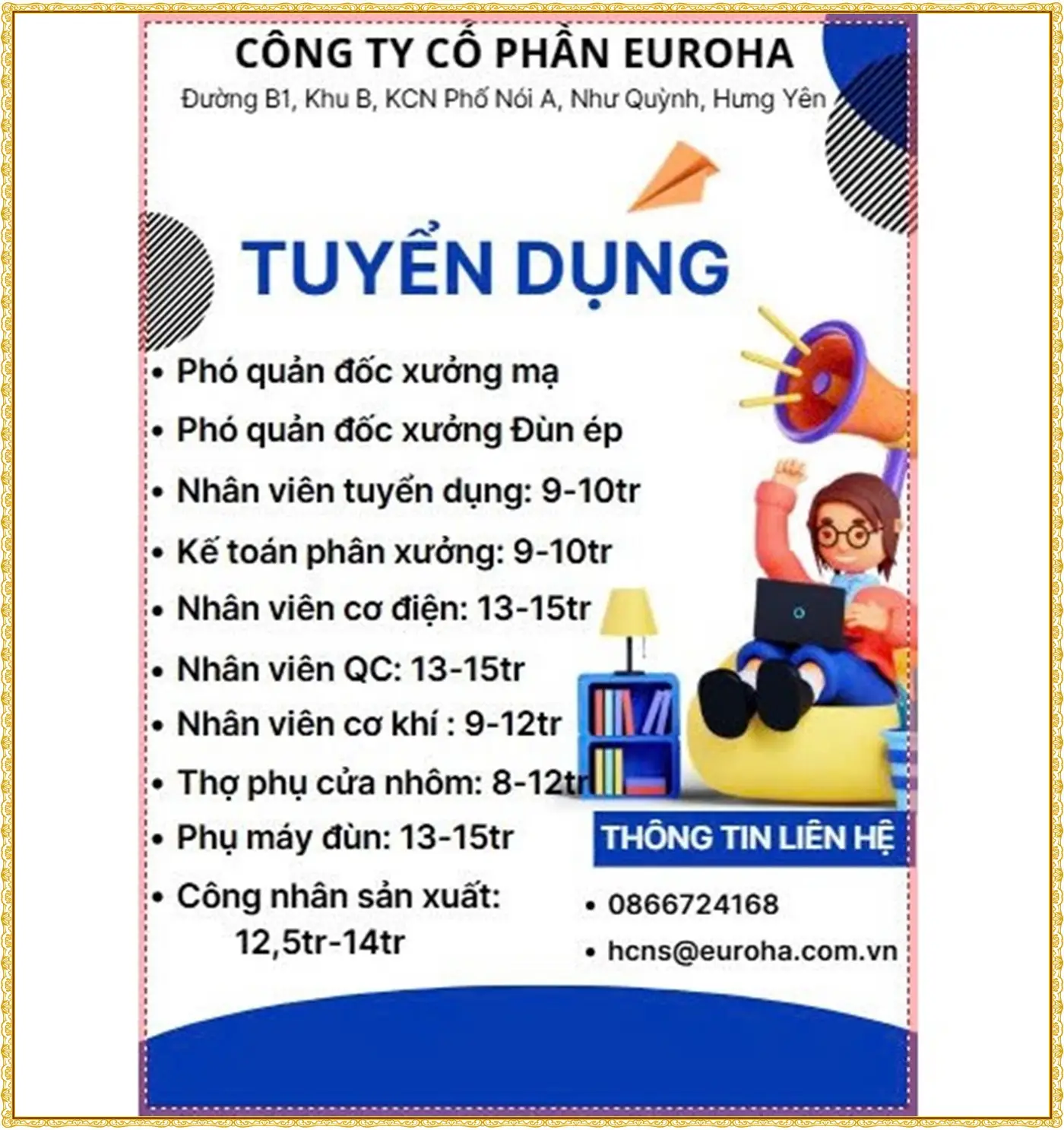 Lương (9-12tr) 📞 Liên hệ: 0989369394 Gửi CV về: