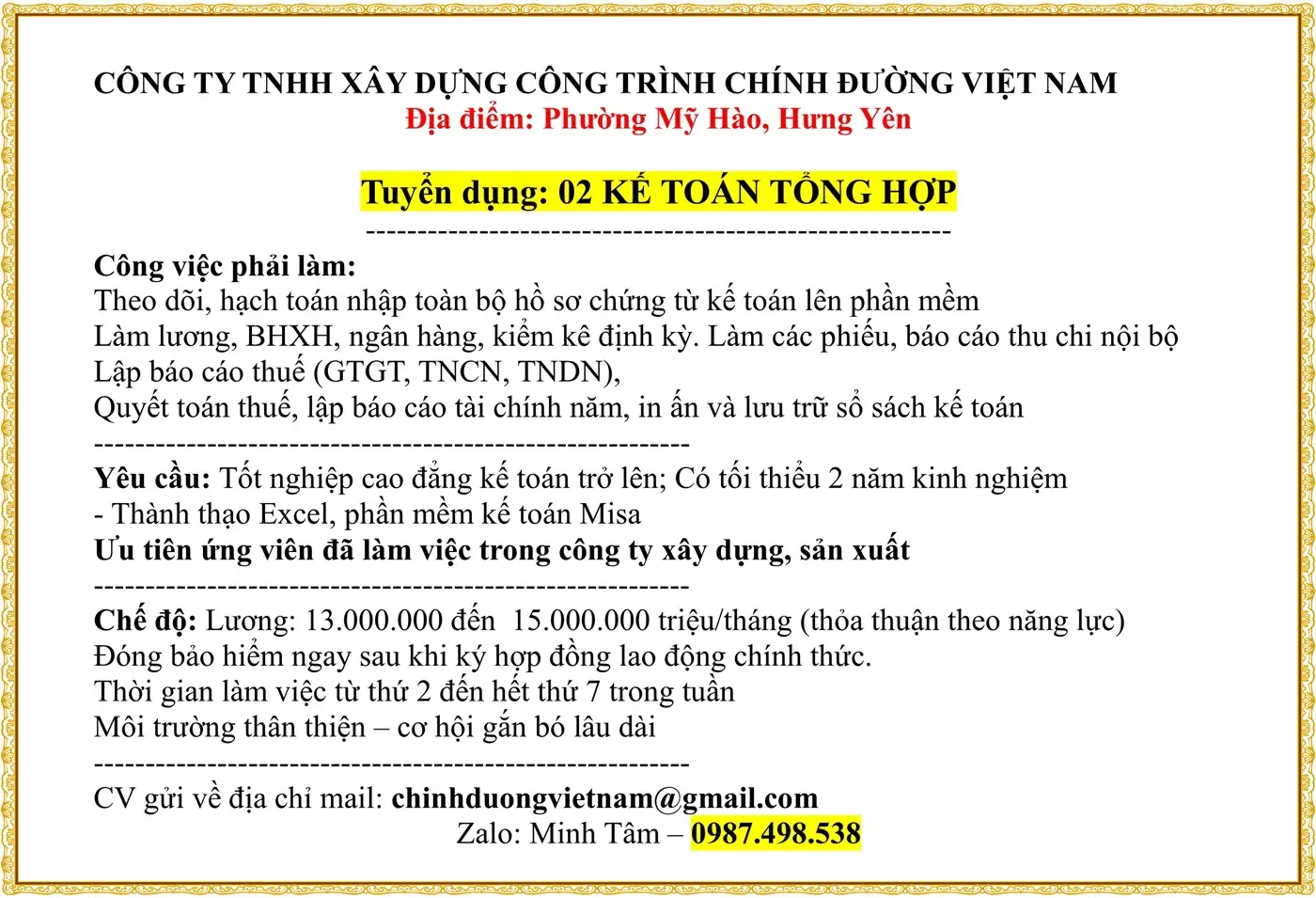 📢 TUYỂN GẤP KẾ TOÁN BÁN HÀNG (02 bạn)
