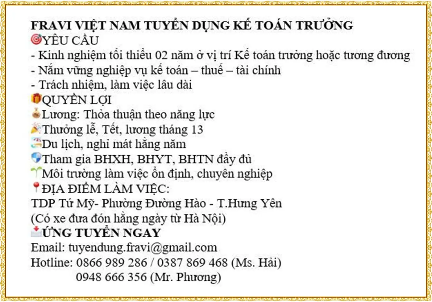 🔹 Yêu cầu: Tốt nghiệp chuyên ngành Kế toán. Có kinh nghiệm từ 2 năm trở lên ở vị trí tương đương.