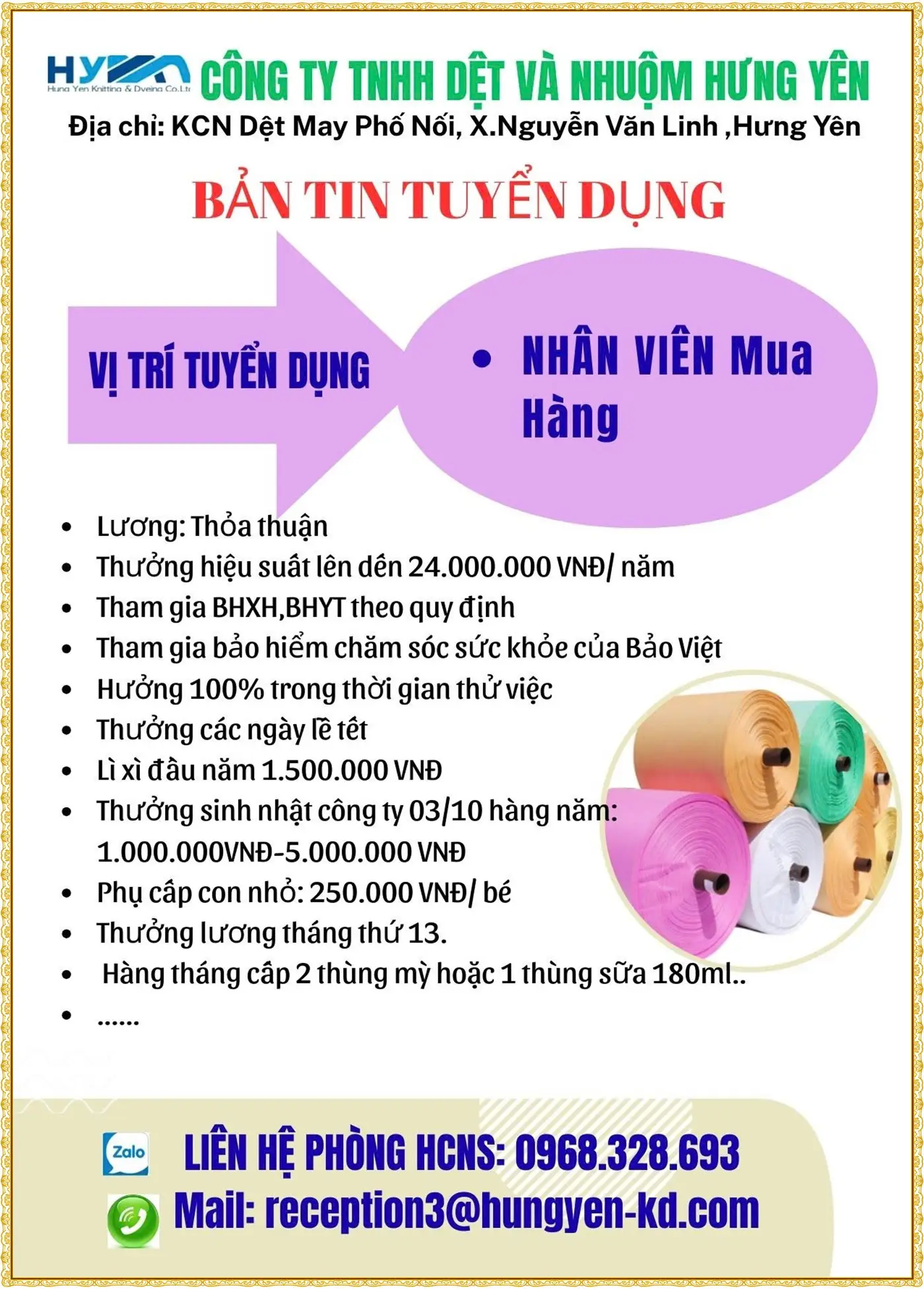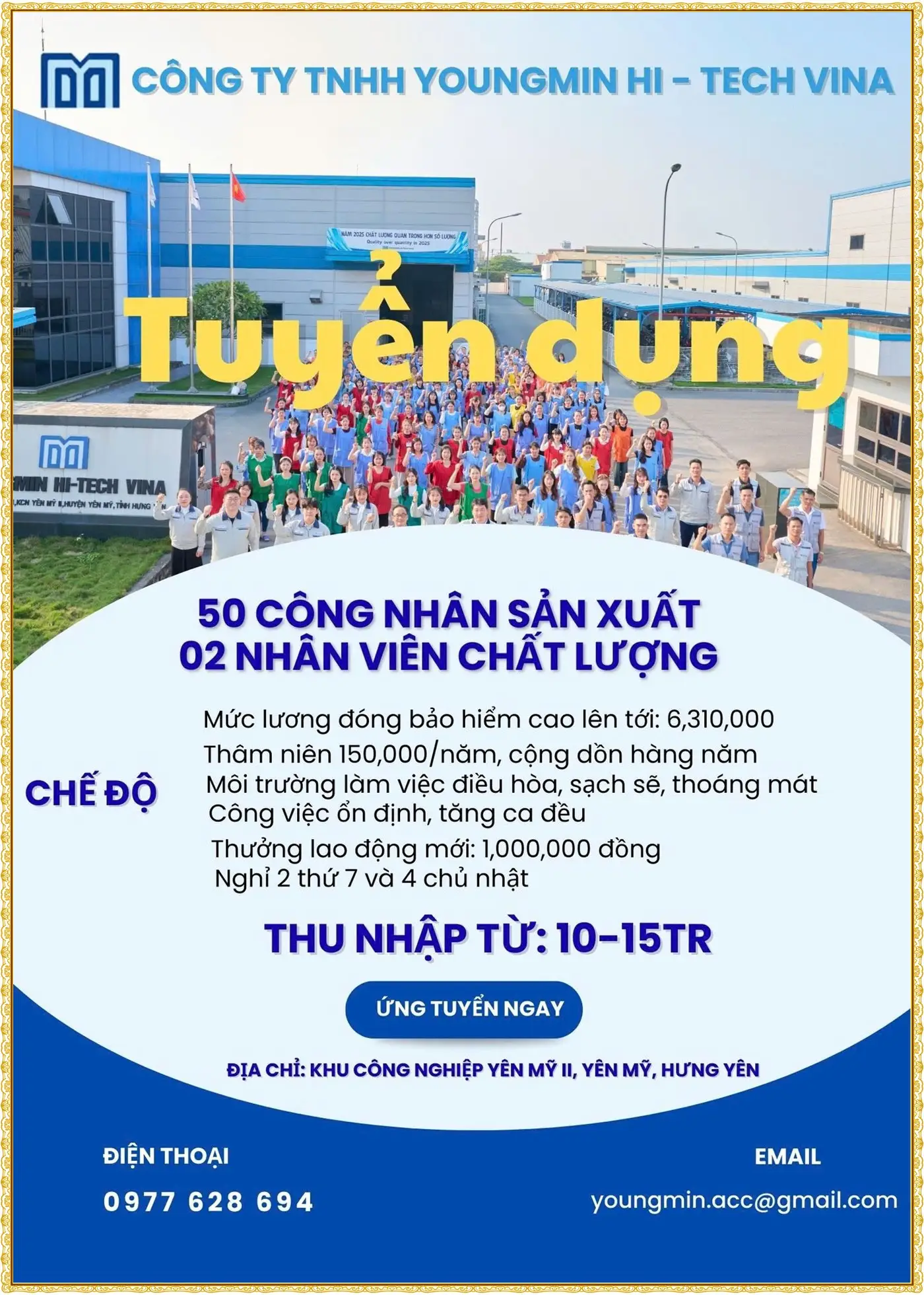 📍 Làm việc tại: thôn Liêu Thượng, Xã Nguyễn Văn Linh, Hưng Yên( đối diện kcn Thăng Long 2)