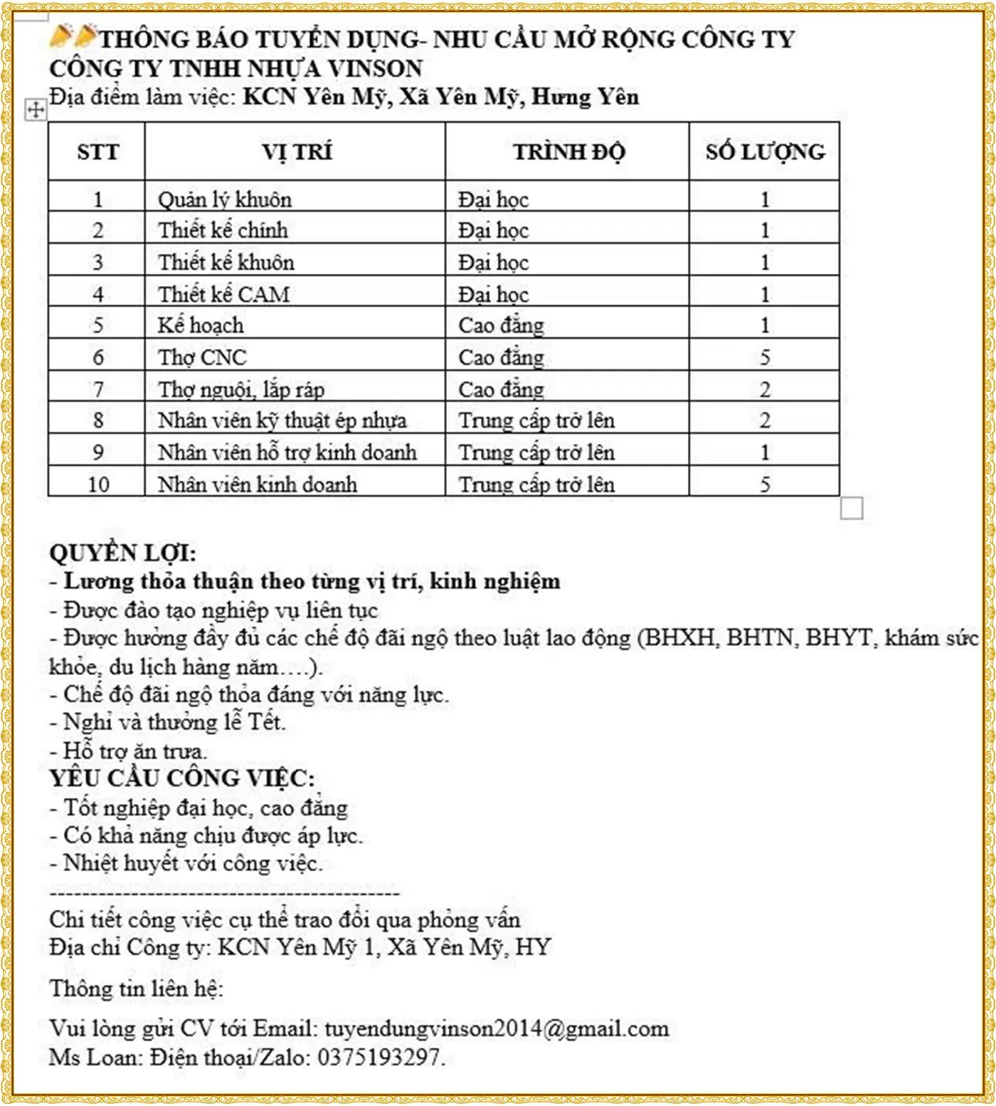 Tin tuyển dụng mới nhất tại Hưng Yên
