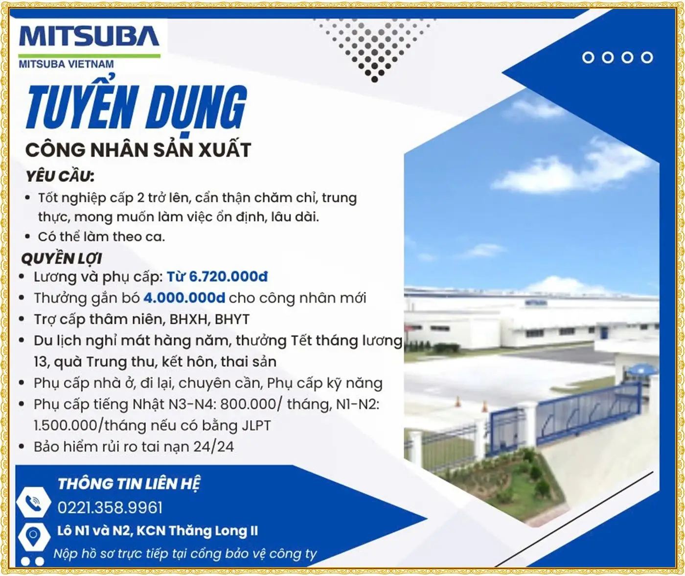 Ưu tiên ứng viên có kinh nghiệm làm công nhân sản xuất (nếu có nhưng không bắt buộc).