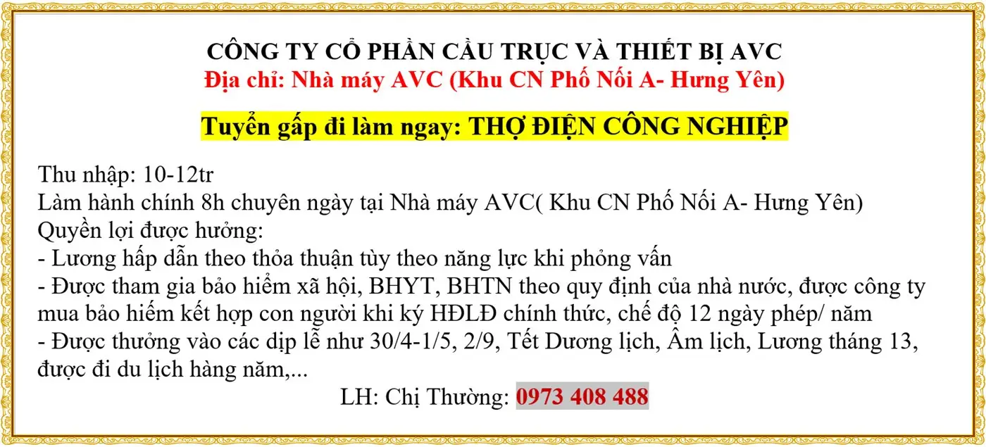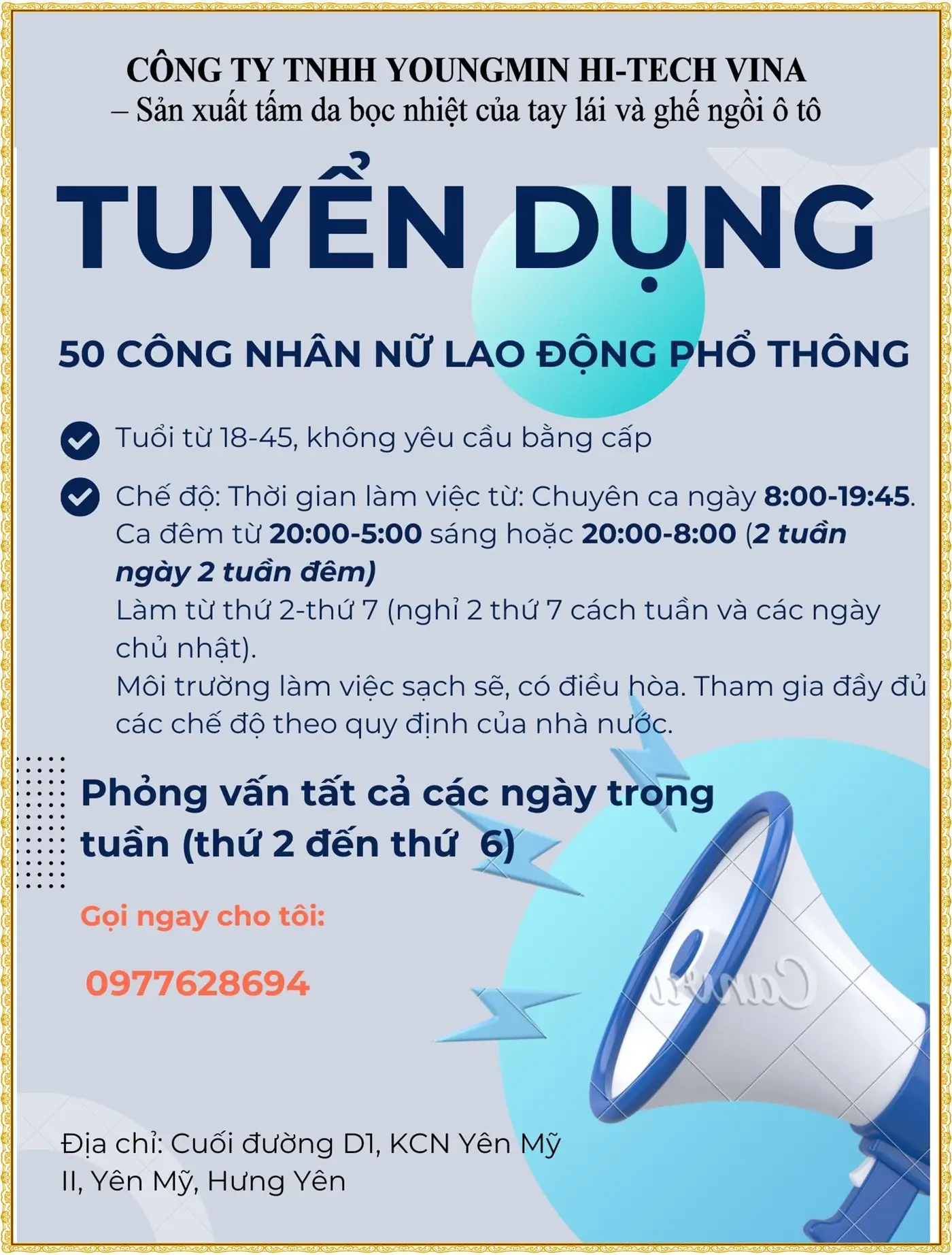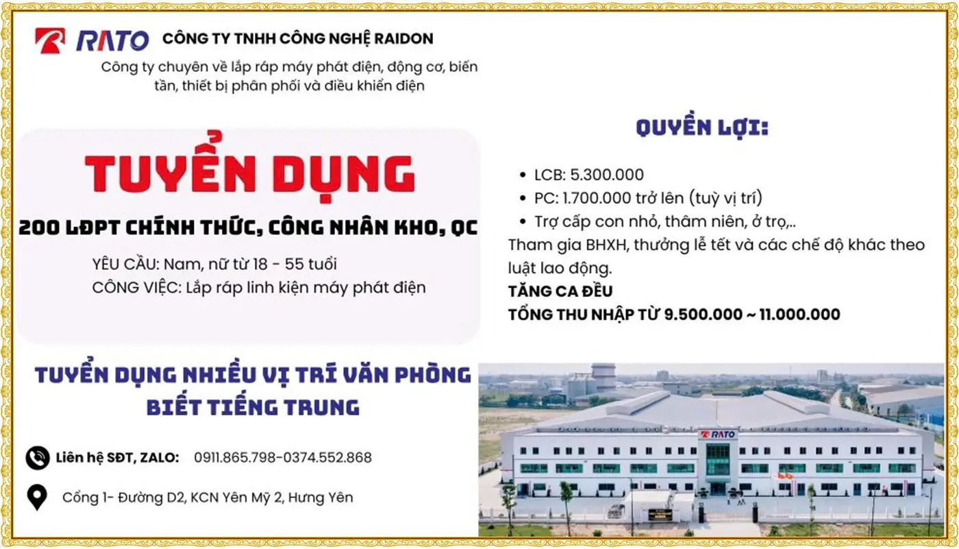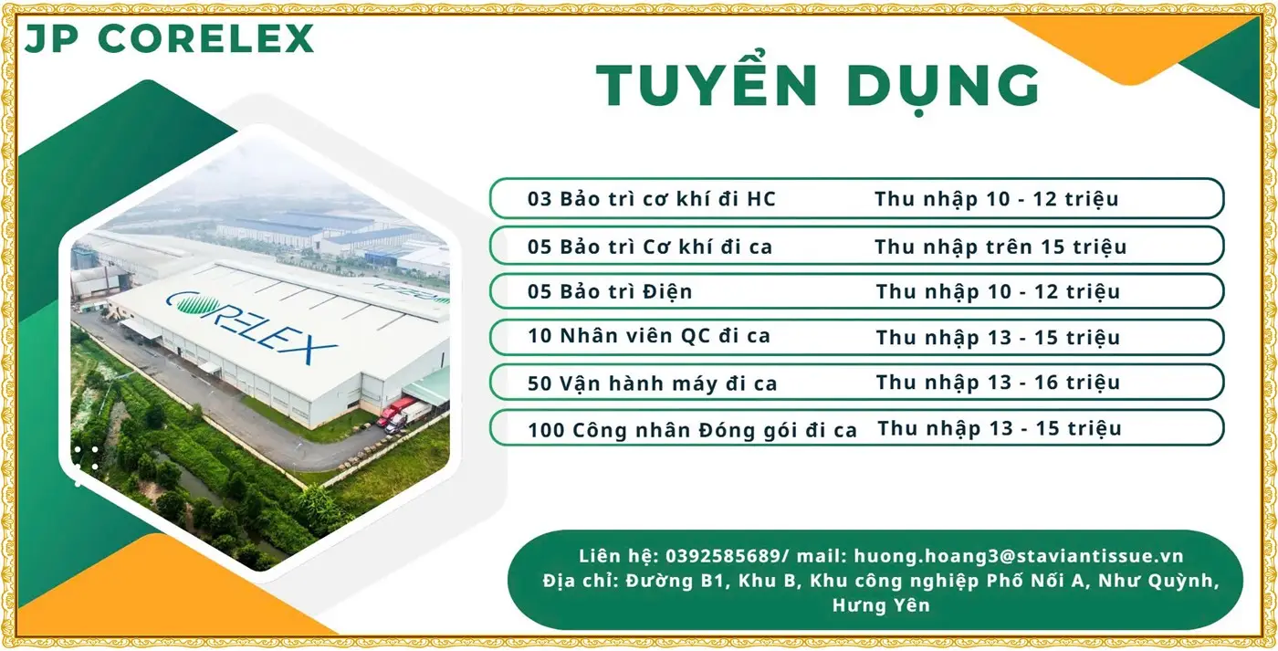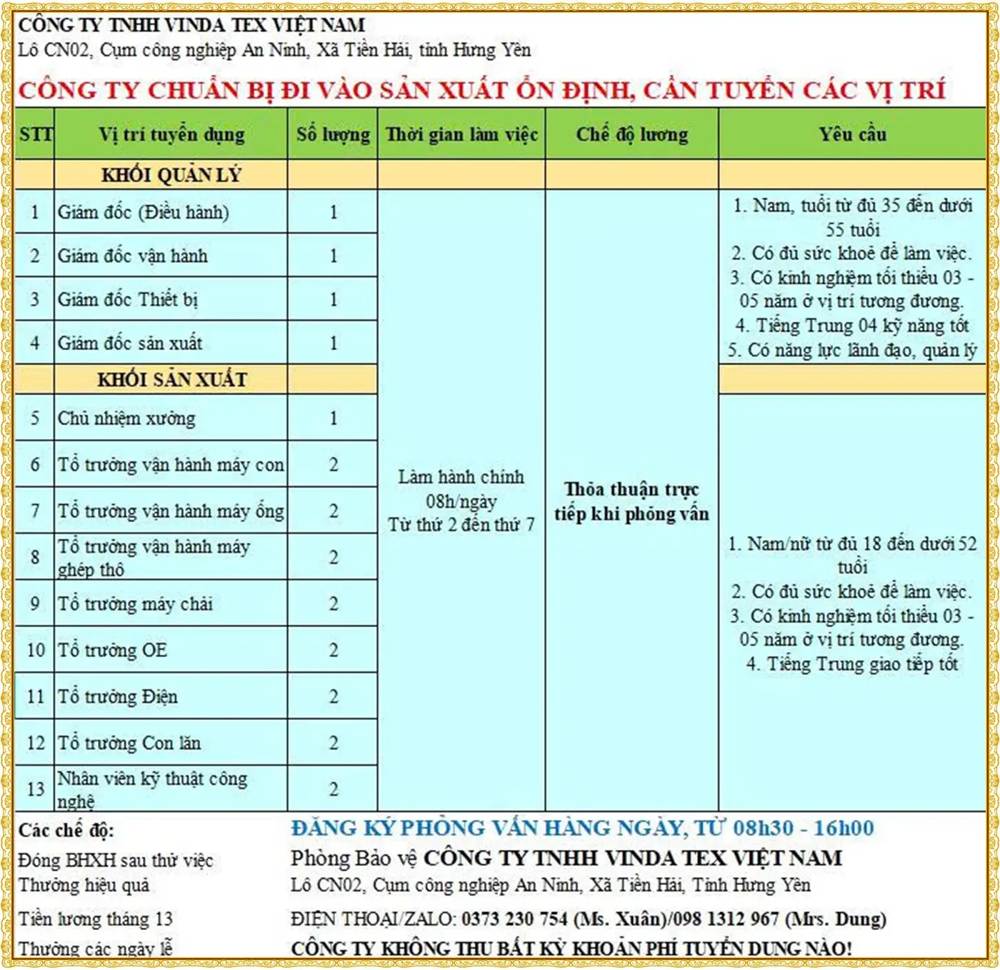 Vieclamhungyen.vn cập nhật vị trí tại các khu công nghiệp và doanh nghiệp địa phương; tin đăng kiểm duyệt và liên hệ trực tiếp.