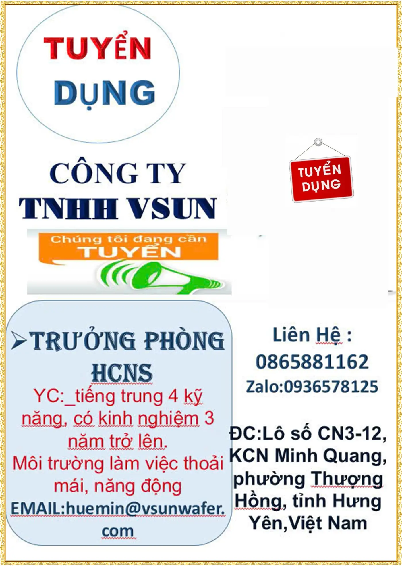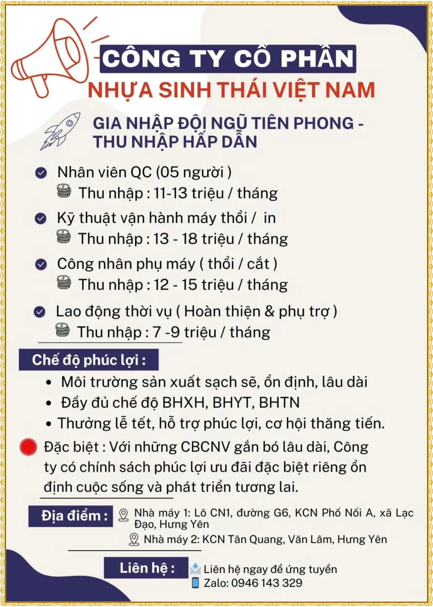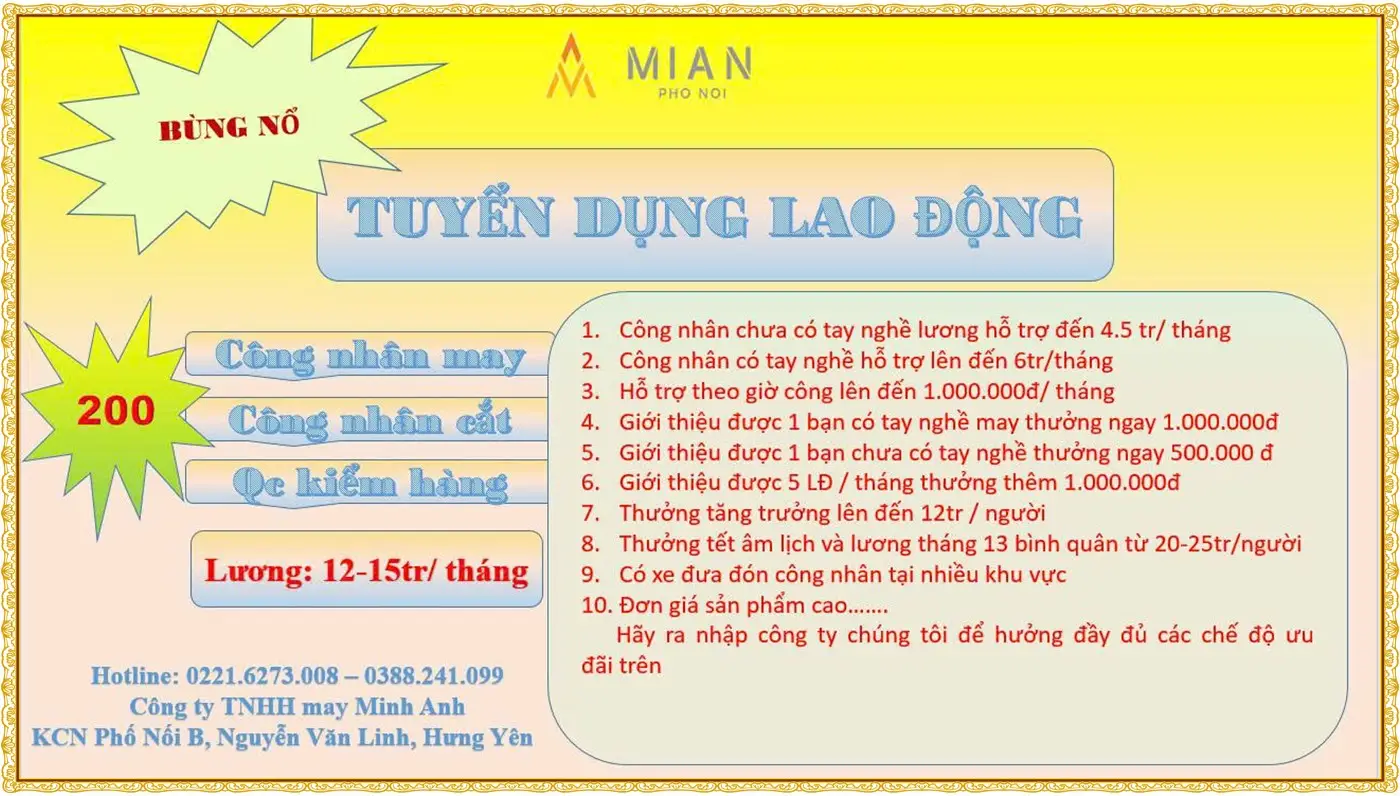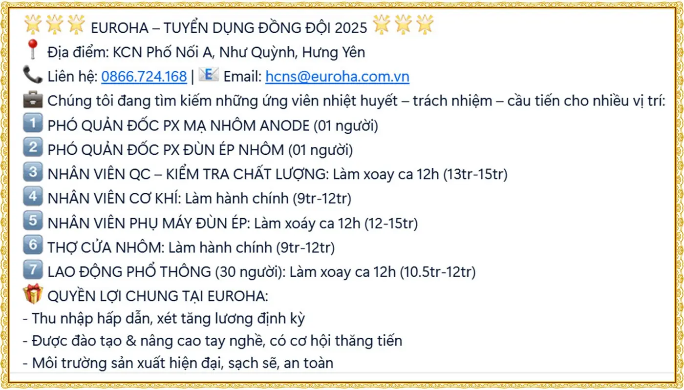 Vieclamhungyen.vn cập nhật vị trí tại các khu công nghiệp và doanh nghiệp địa phương; tin đăng kiểm duyệt và liên hệ trực tiếp.